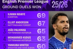 本赛季英超地面成功对抗榜:恩迪亚耶居首,多库、格拉利什在列