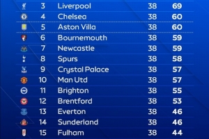 体育资讯10月31日讯 Opta数据给出了最新一期的2025/26赛季英超联赛最终排名预测,阿森纳夺冠。
