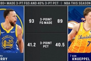 黄蜂主场迎战老鹰,转播方晒出新秀克尼佩尔的数据,本赛季仅有两位球员在命中率40%以上的情况下命中了80记三分球,分别是: