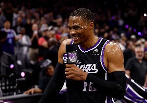本场比赛,威少出战37分28秒,17中10,其中三分6中3,罚球4中4,得到26分12篮板6助攻2抢断,正负值-5。
